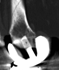 - proximal to femoral prosthesis