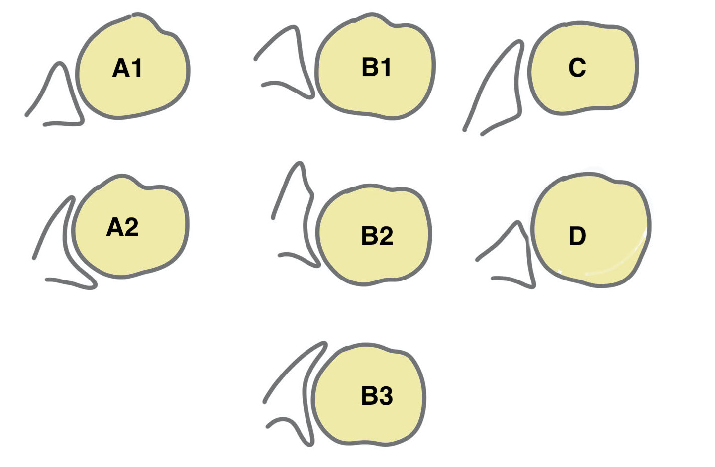 B3: monoconcave glenoid with > 15° retroversion or >70% posterior humeral head subluxation or both