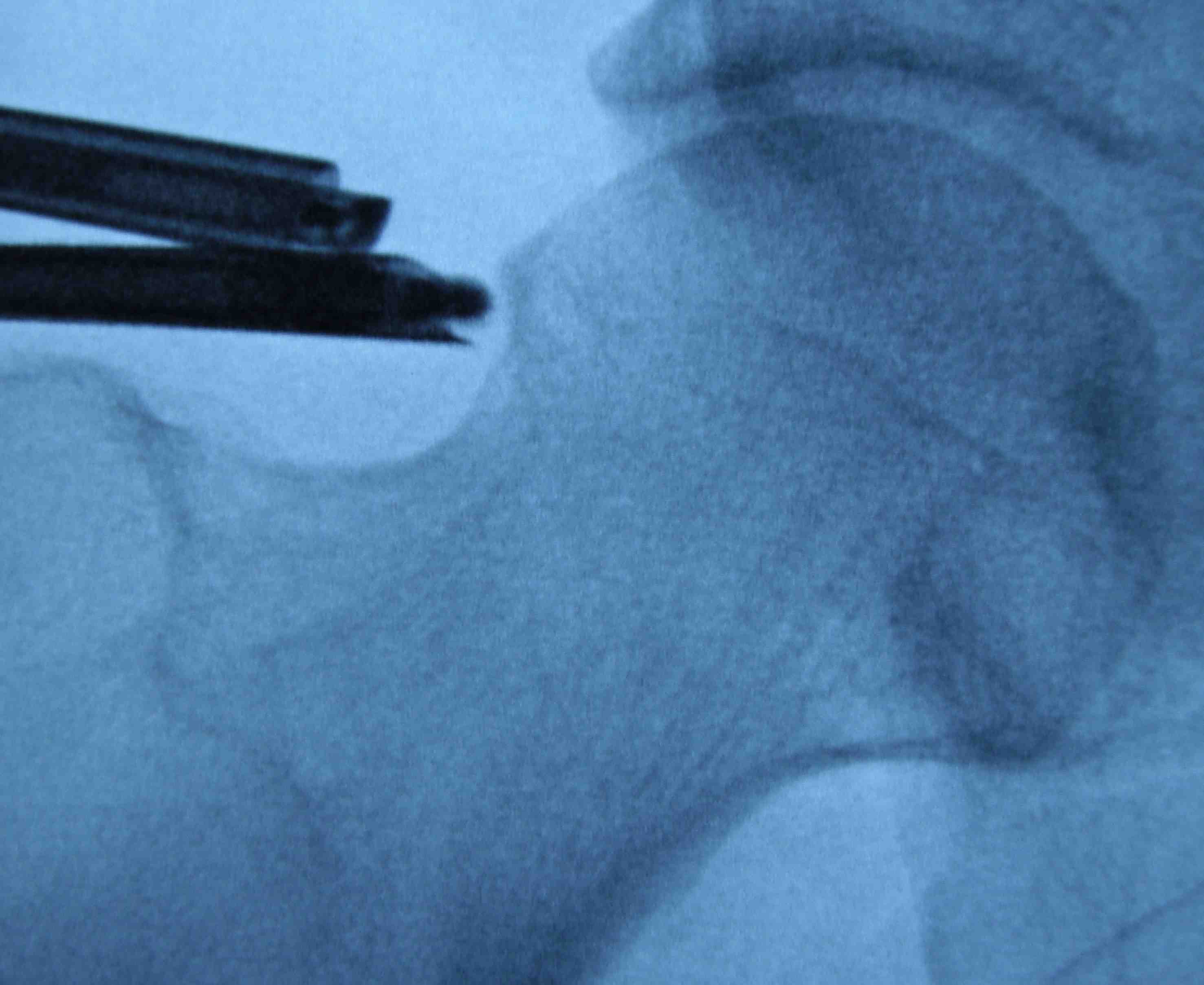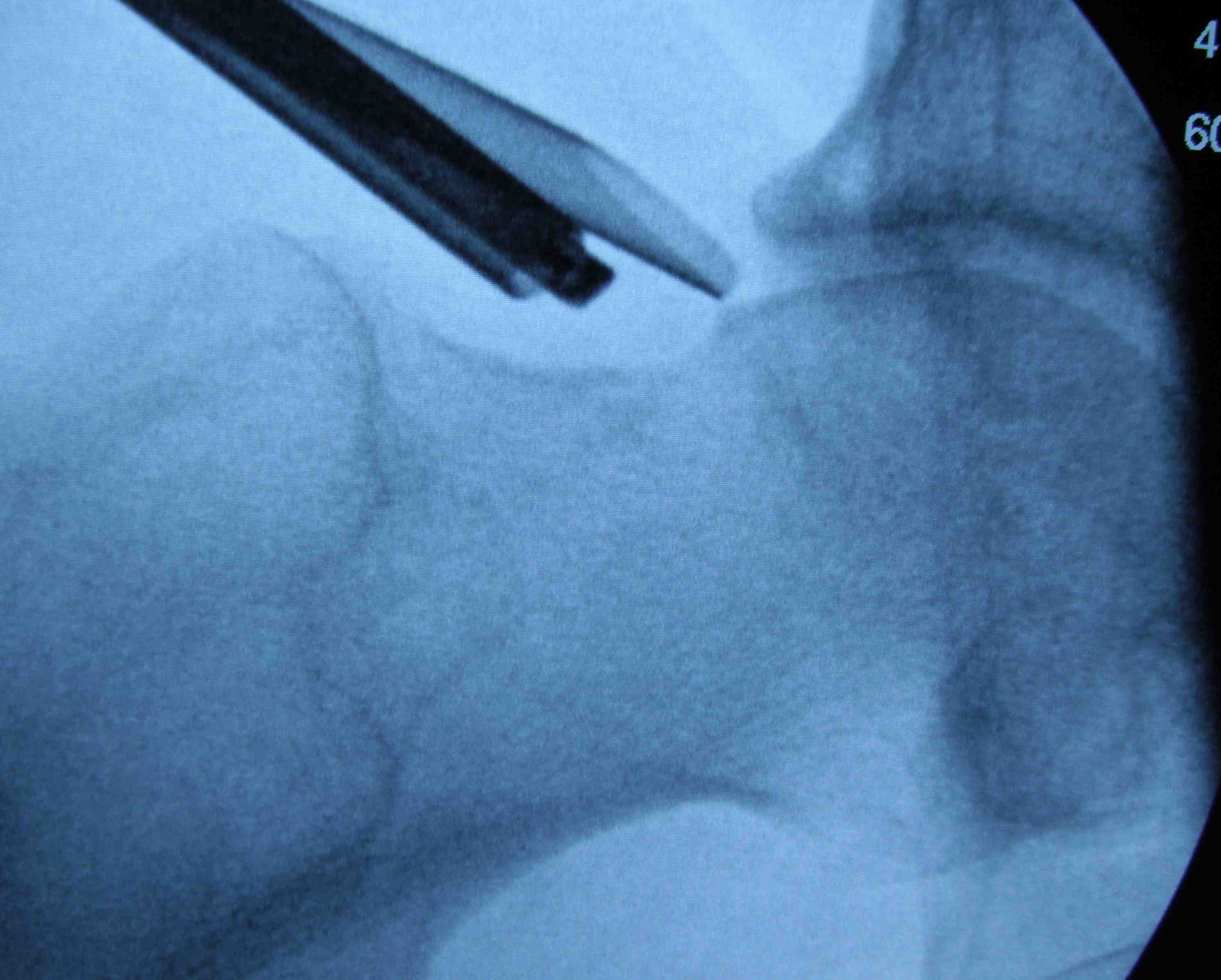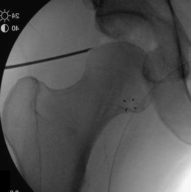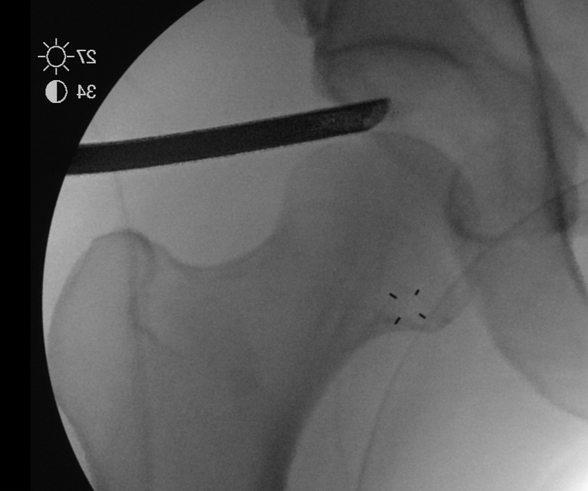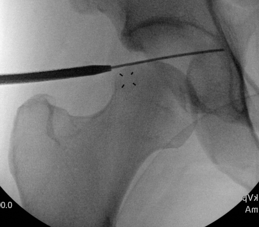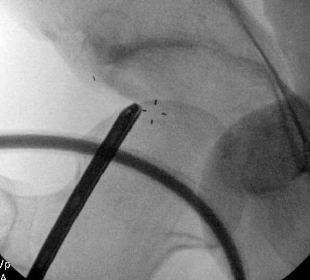 - insert just above head to avoid translabral penetration (between acetabulum and labrum)