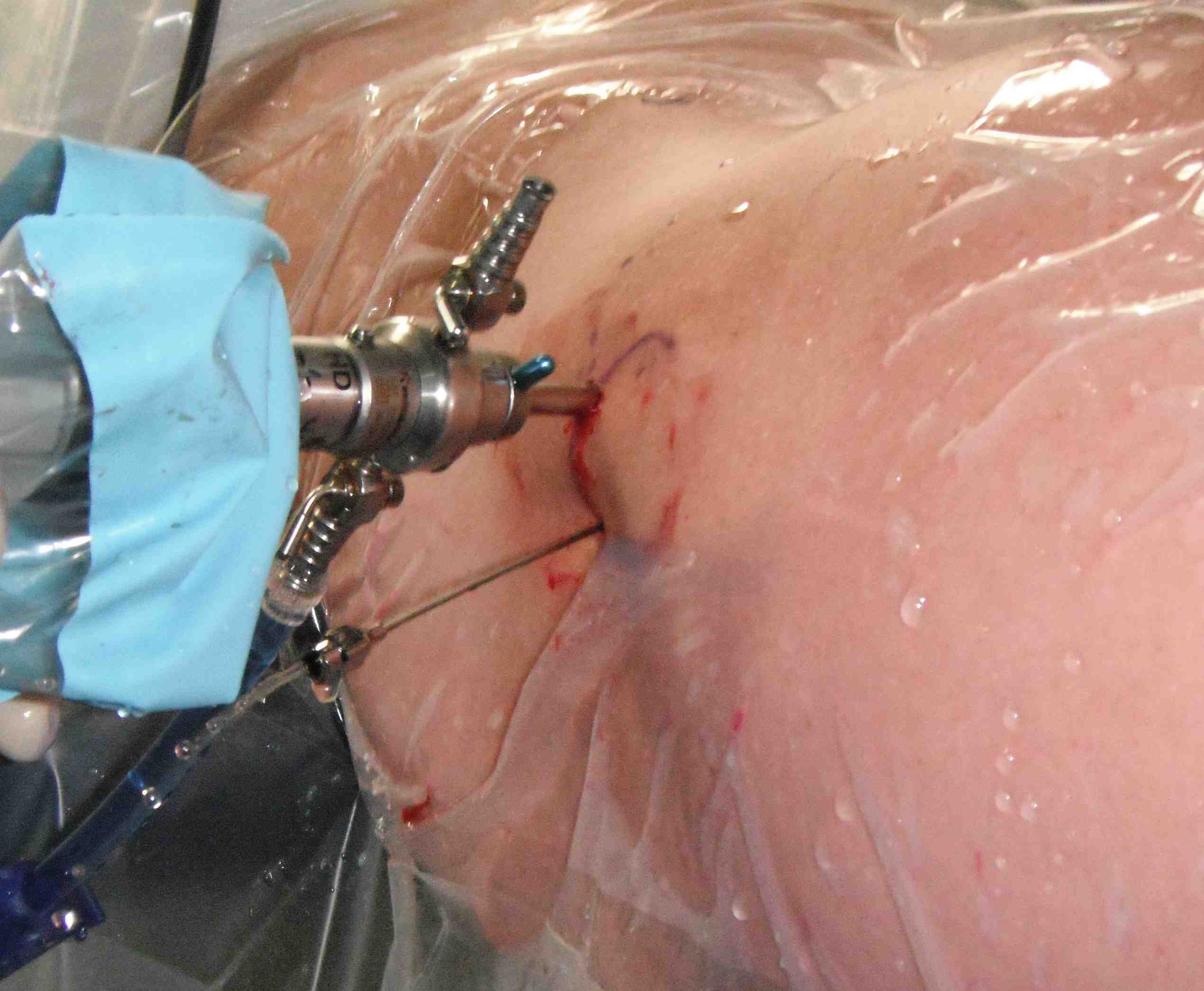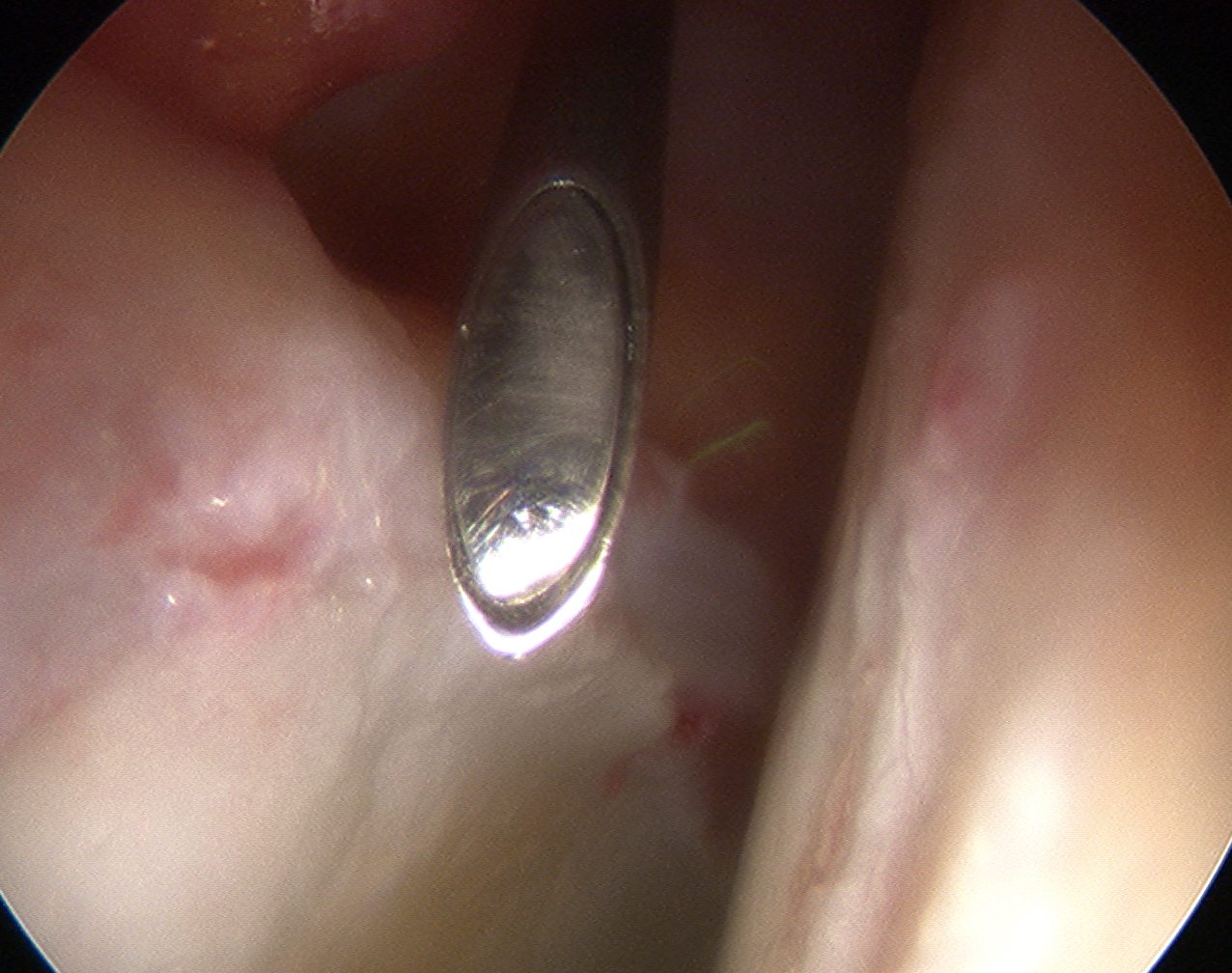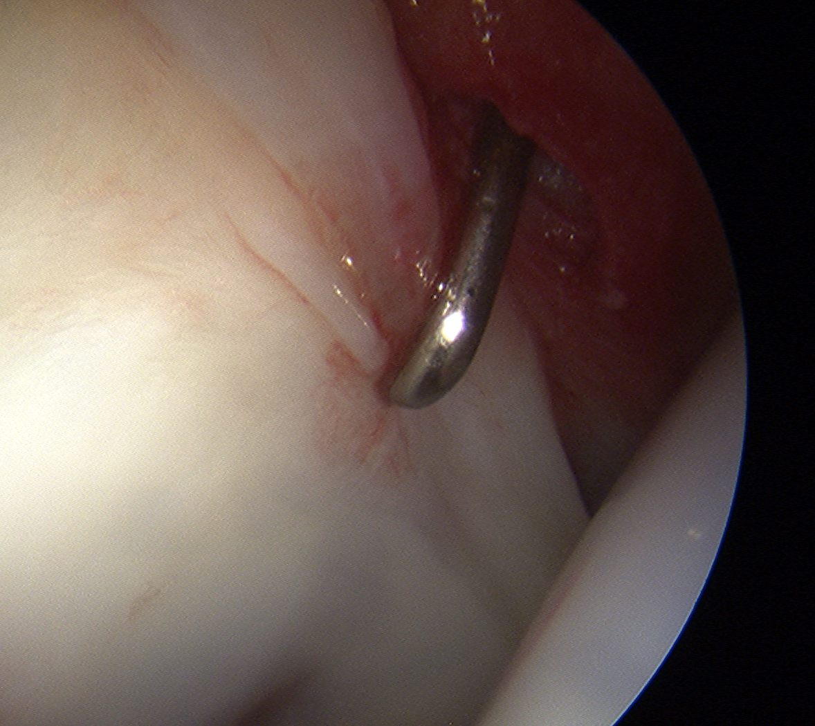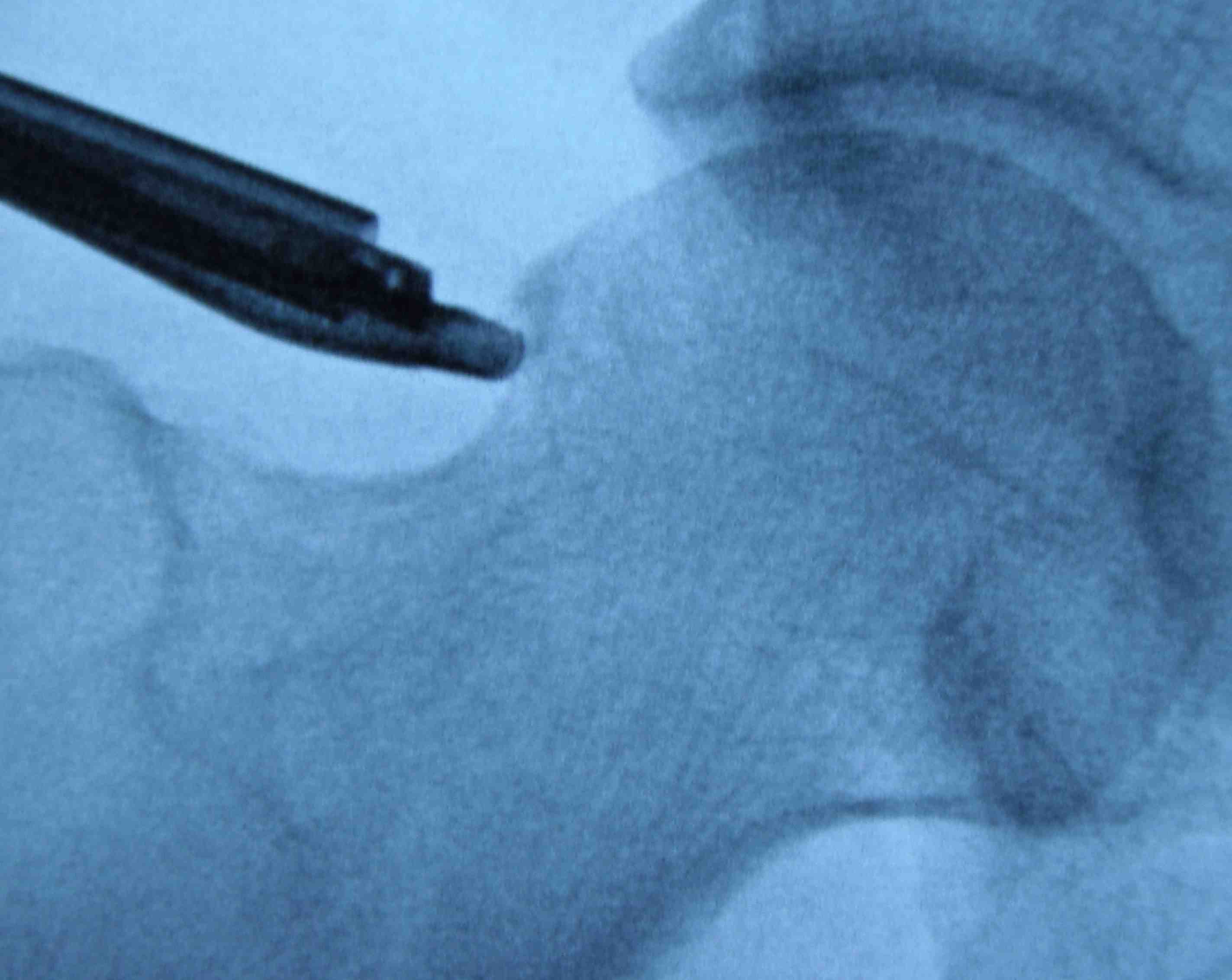 - insert just above head to avoid translabral penetration (between acetabulum and labrum)