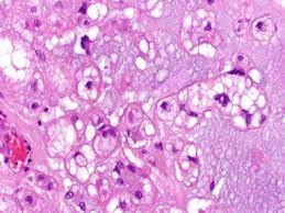 - cells have bubbly pink cytoplasm & Bulls-Eye nucleus