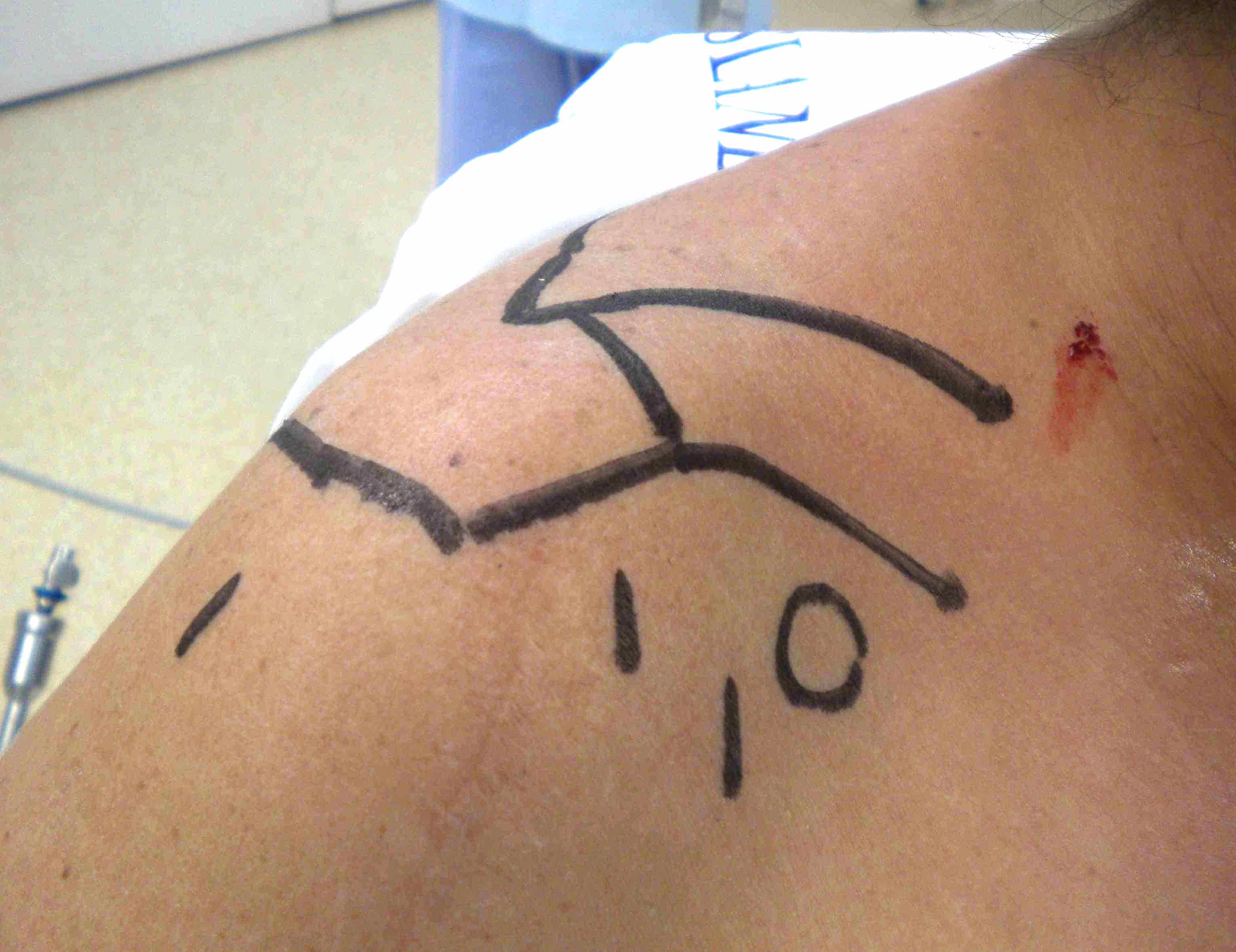 Identify posterolateral corner acromion 2 cm below and 2 cm medial Feel glenohumeral joint with trochar Aim towards coracoid |