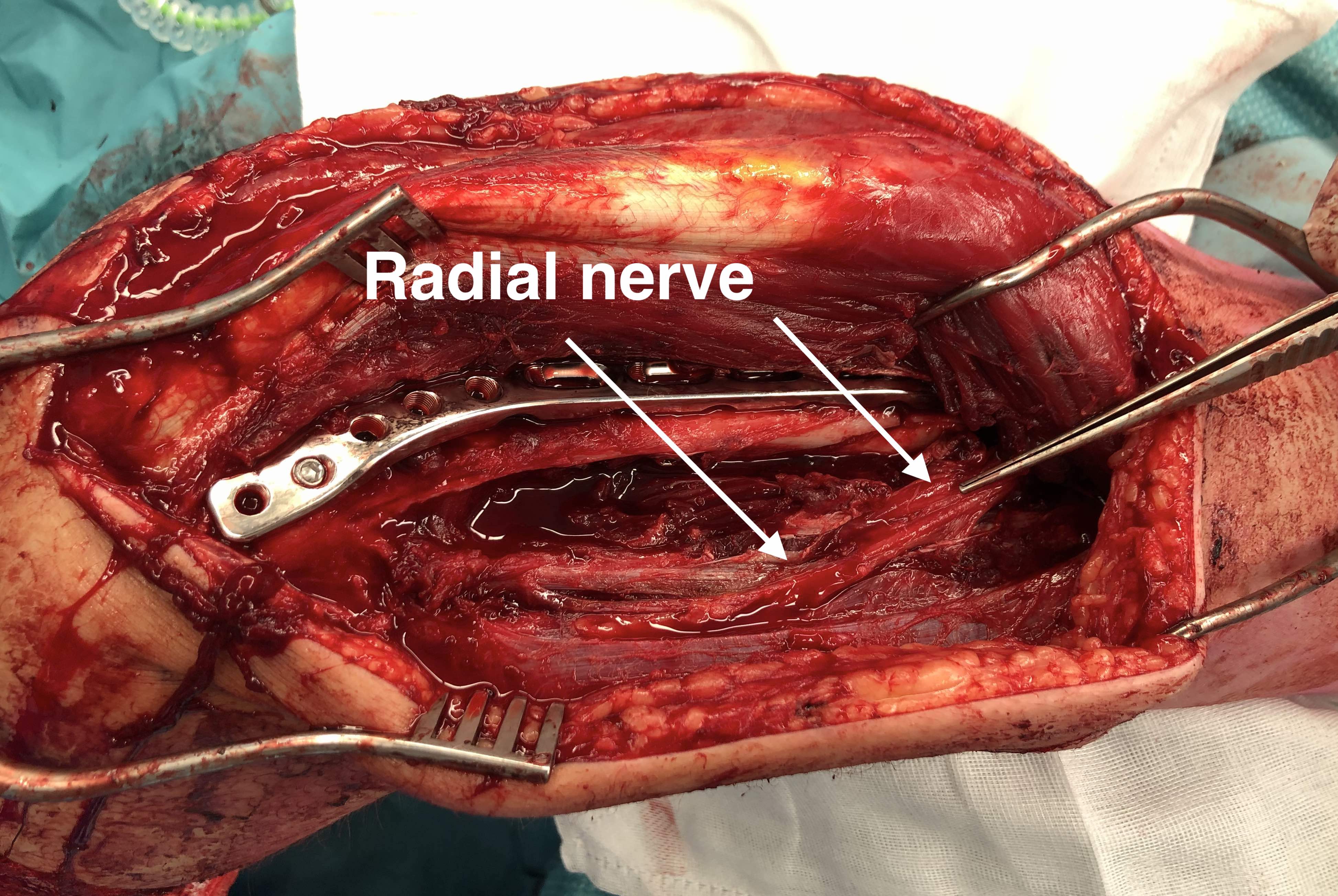 - the radial nerve is closely assoicated with the fracture site and the fracture spike