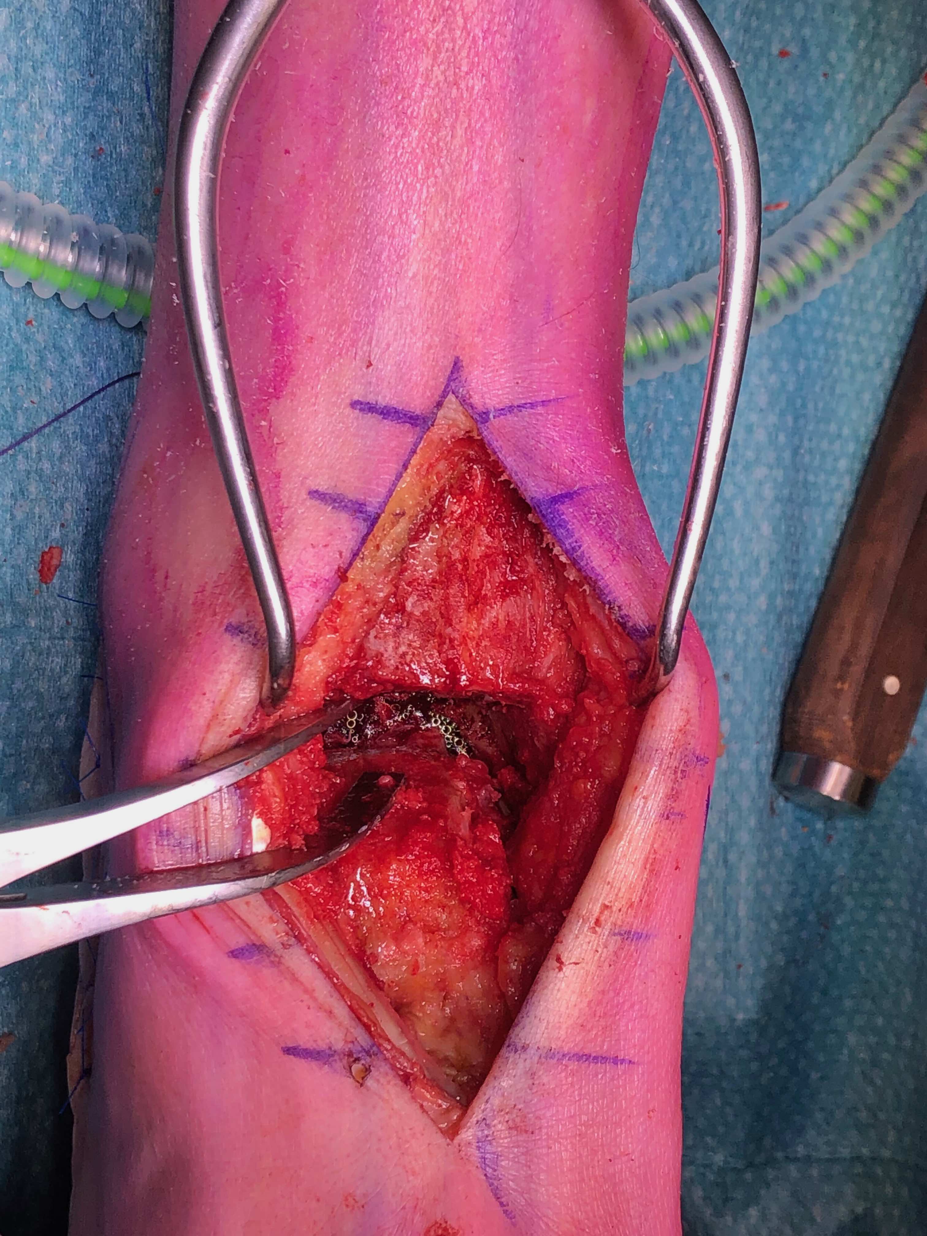 - subperiosteally expose distal fibula