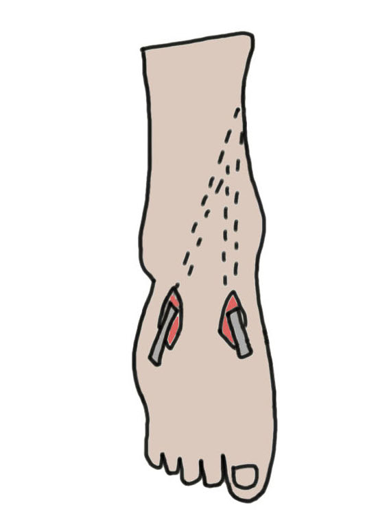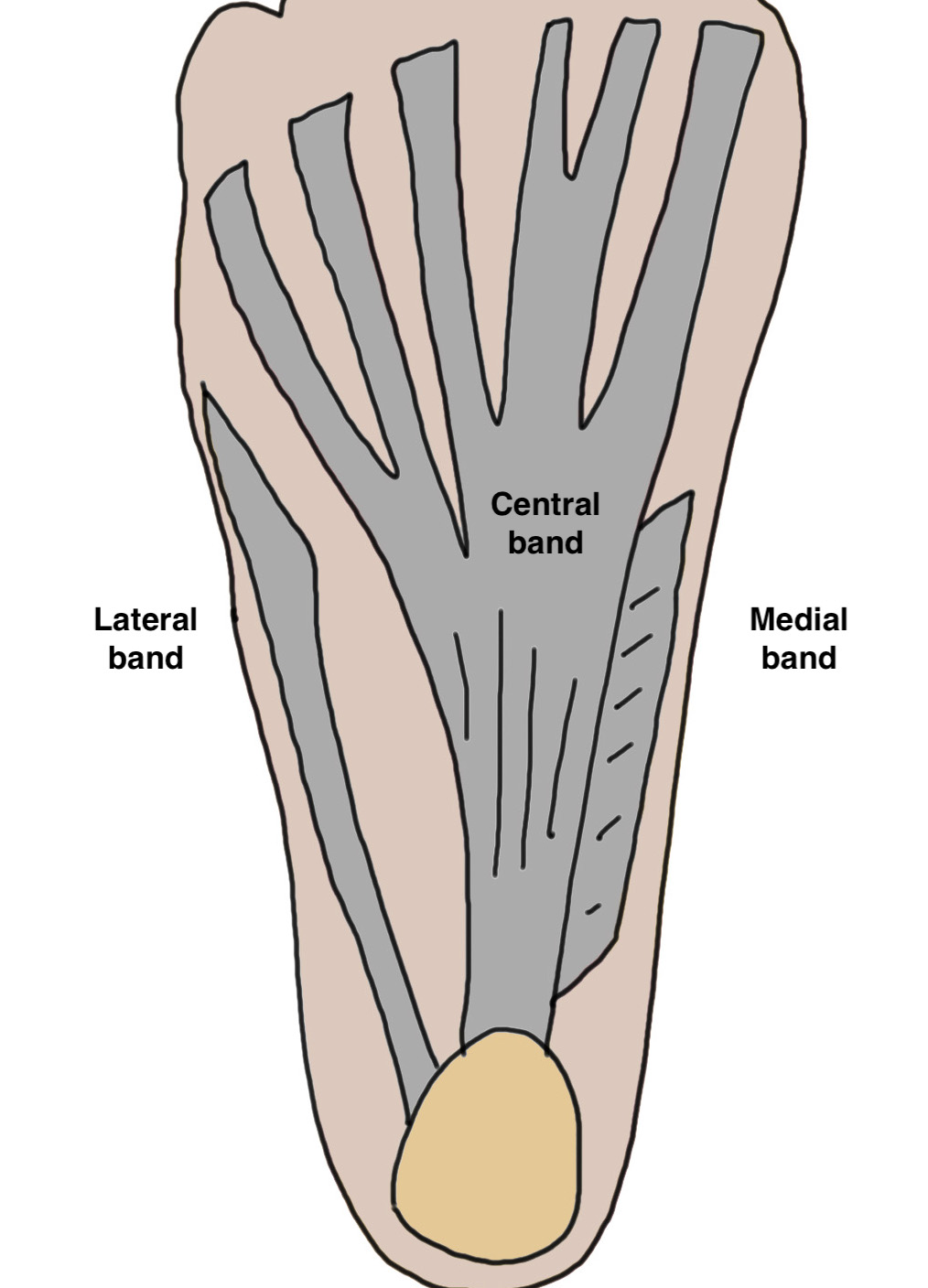 - 2-3 cm at plantar aspect of calcaneal insertion