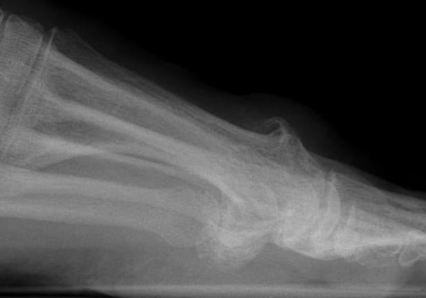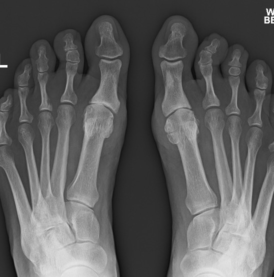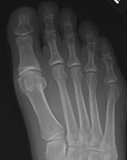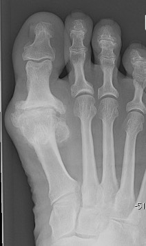 Painful restriction of dorsiflexion of the great toe secondary to dorsal osteophytes