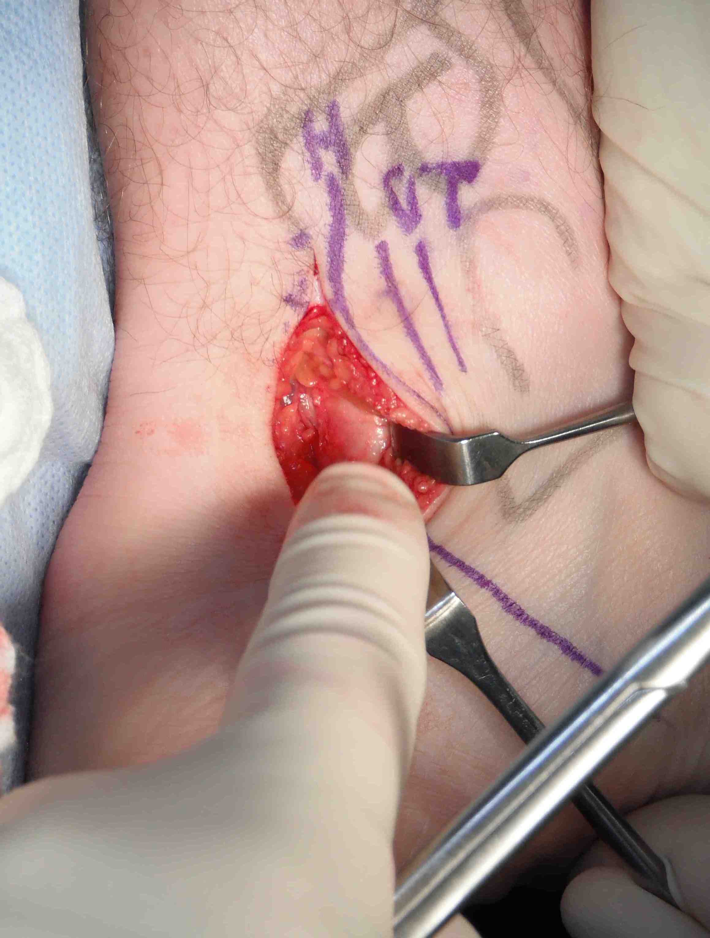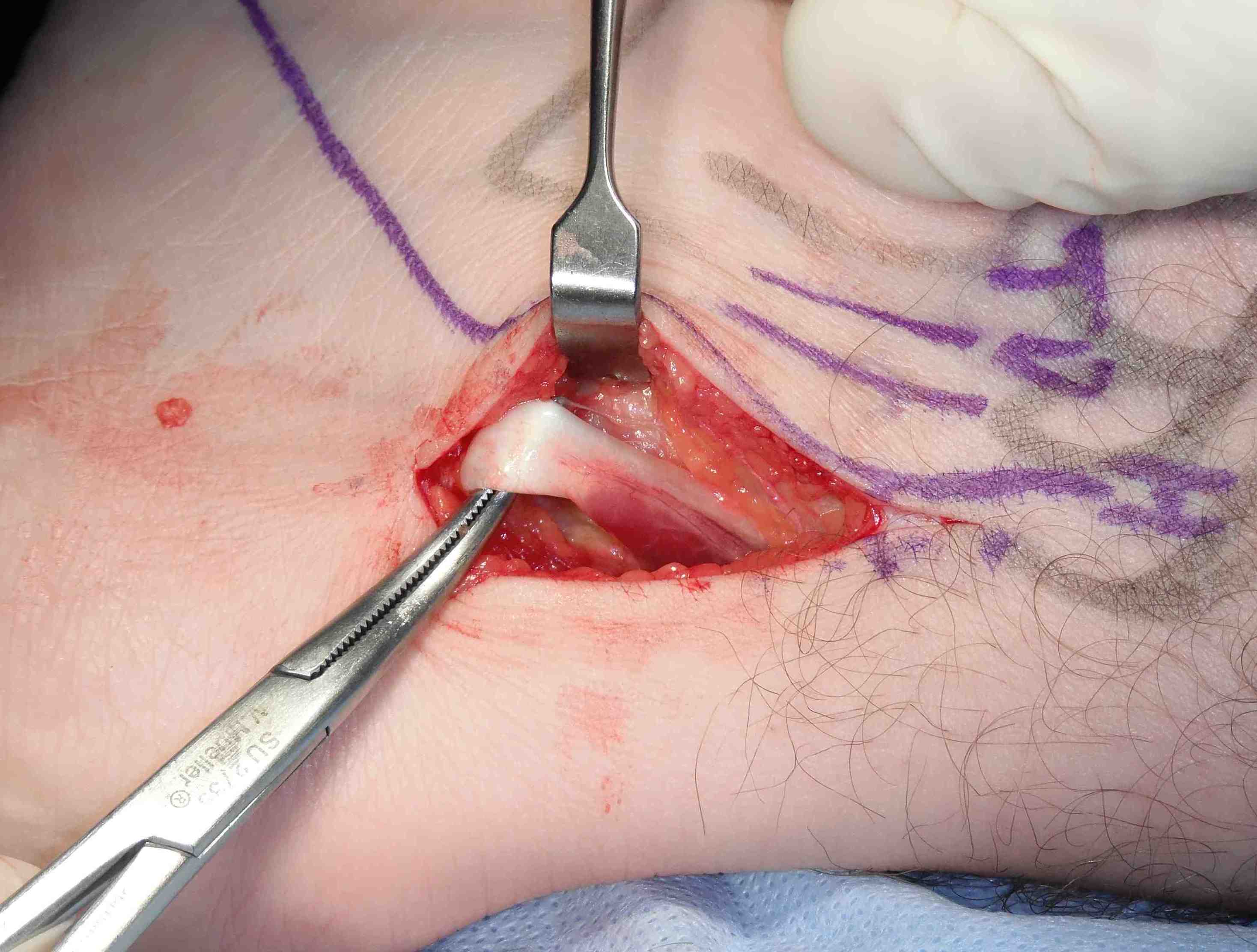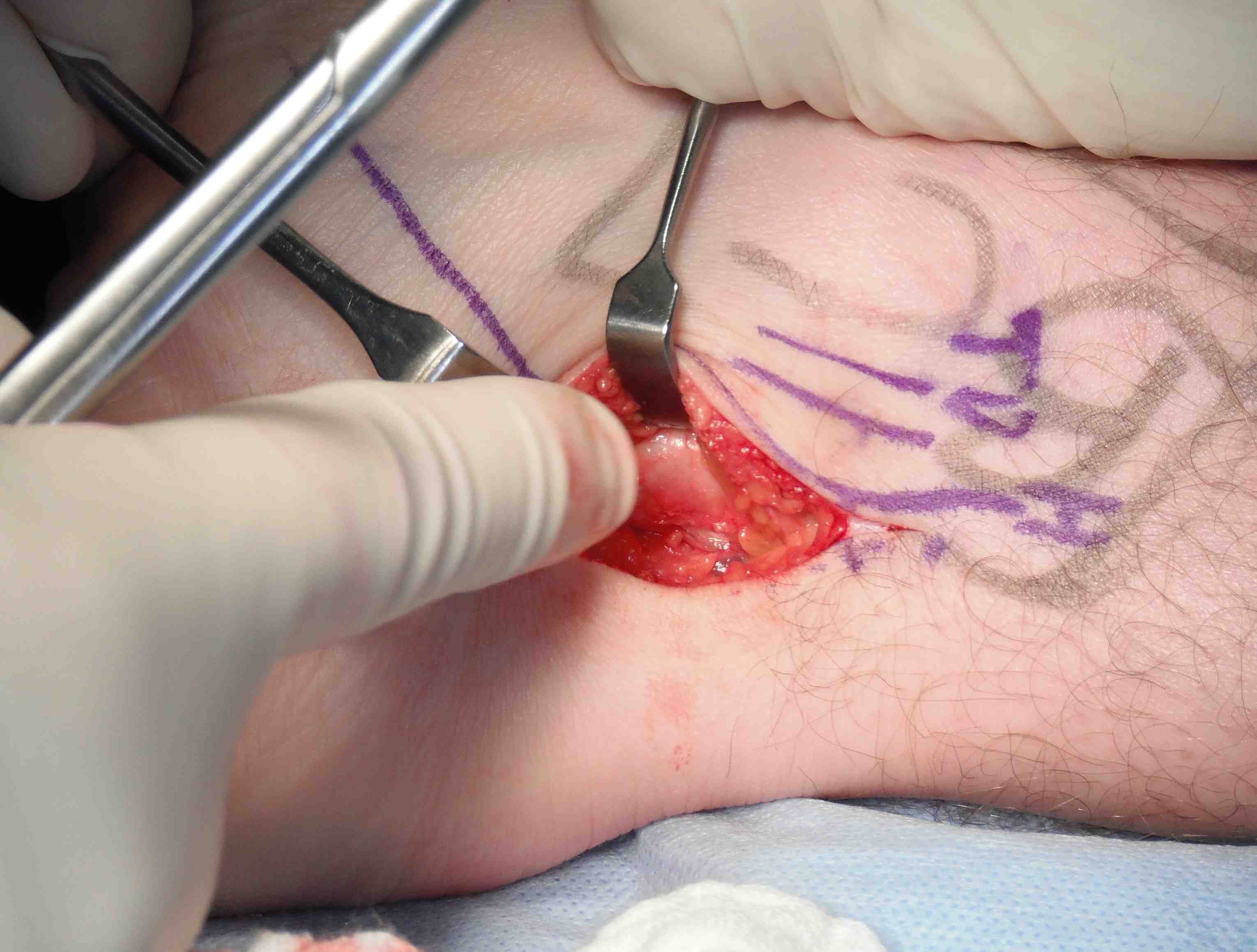 Posteromedial approach and identification of FHL fibro-osseous tunnel