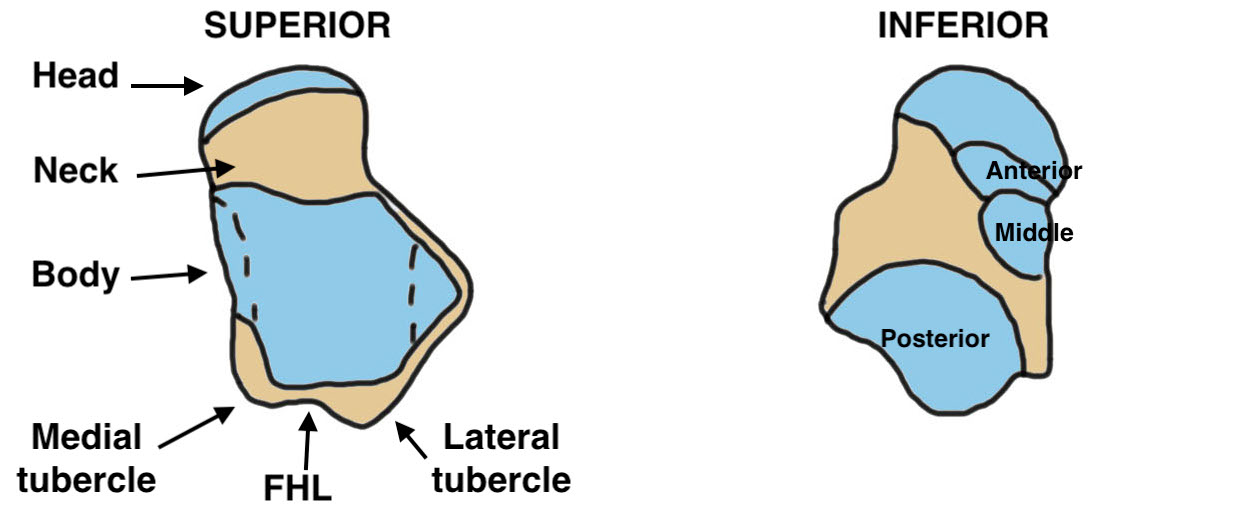 | Articulate with medial & lateral malleolus | Conduit for blood supply to body | Supported by spring ligament | Articulate with calcaneal facets below |