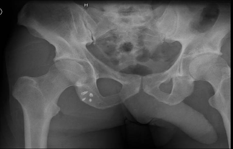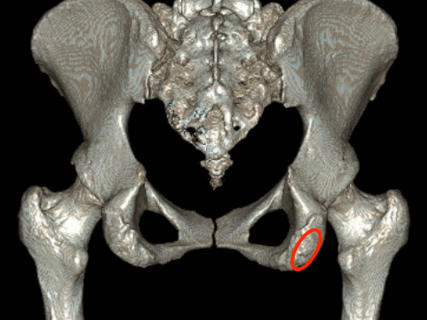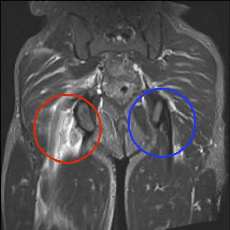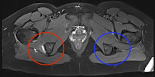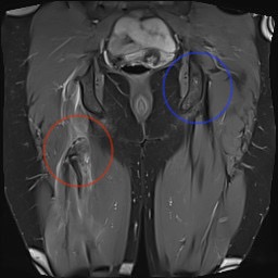 Proximal hamstring avulsion on right - red circle is retracted hamstring tendon, blue circle is normal insertion on left