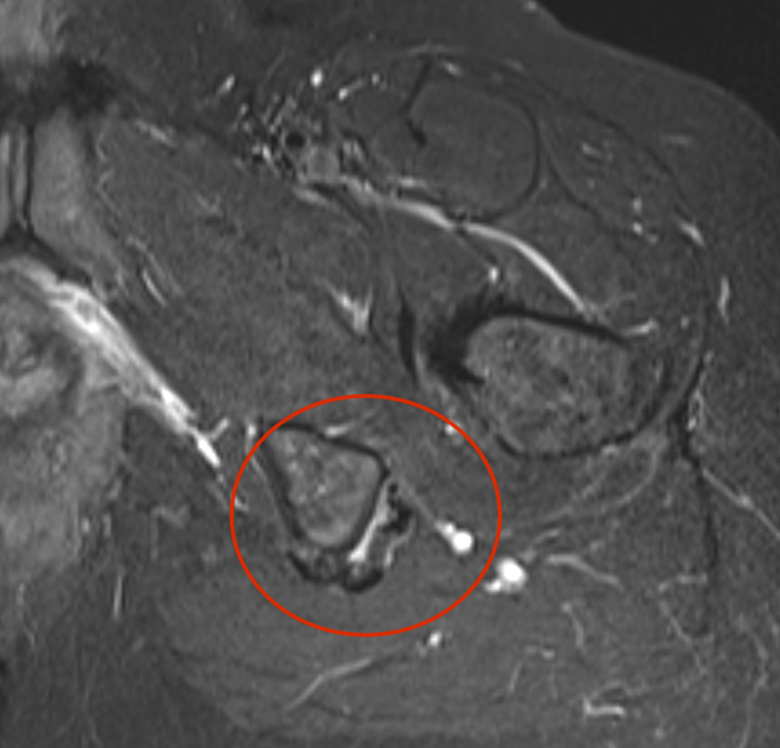 Proximal hamstring tear on right (red circle), normal insertion on tuberosity on left (blue circle)