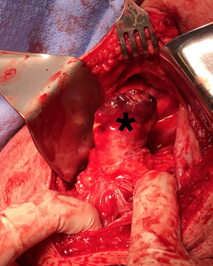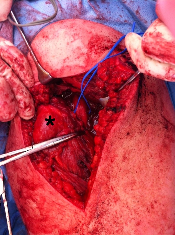 Hamstring (*) with sciatic nerve lateral to hamstring (blue vessiloop)
