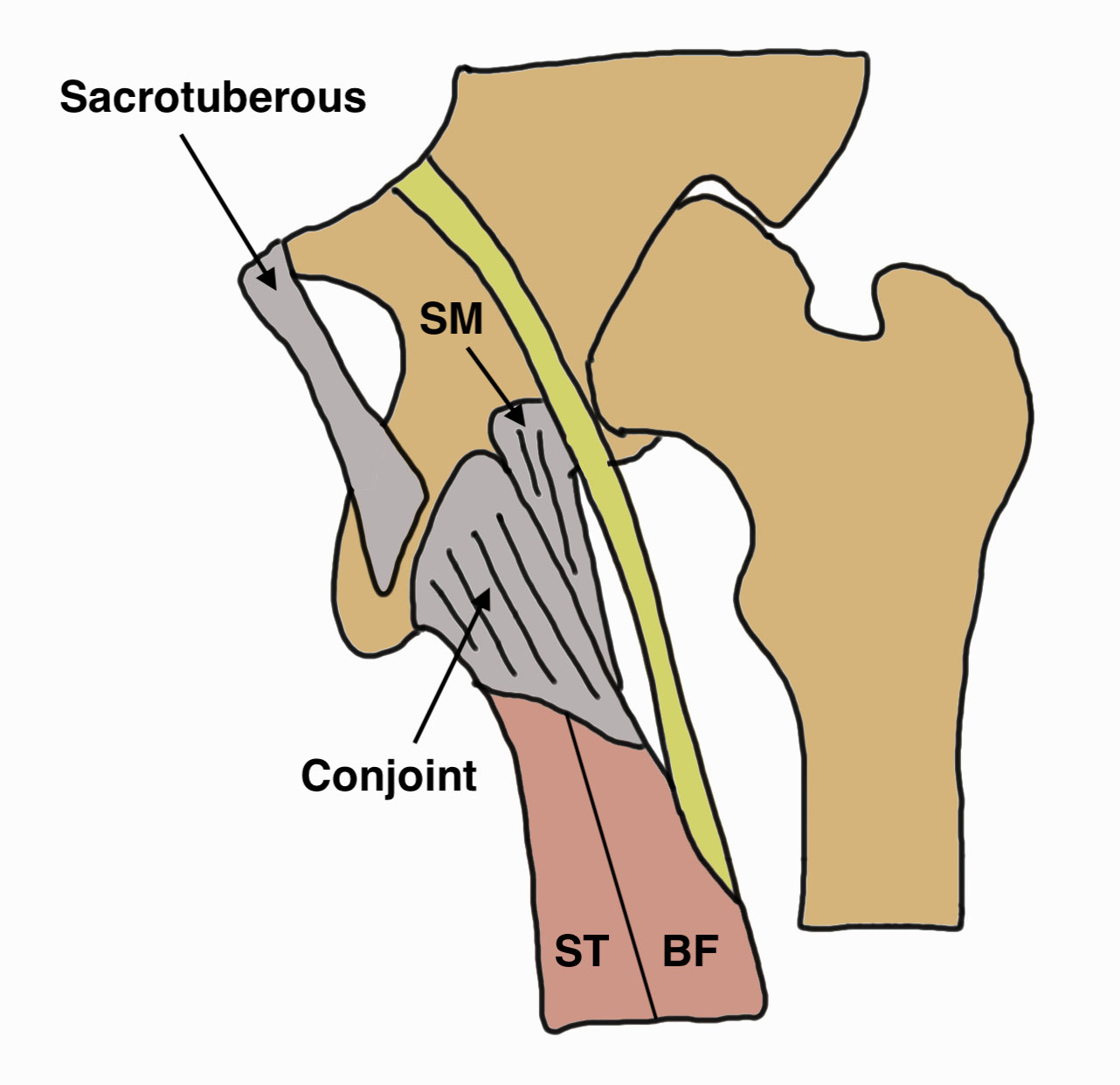 Hamstring by definition originate from the (lateral aspect of) the ischial tuberosity