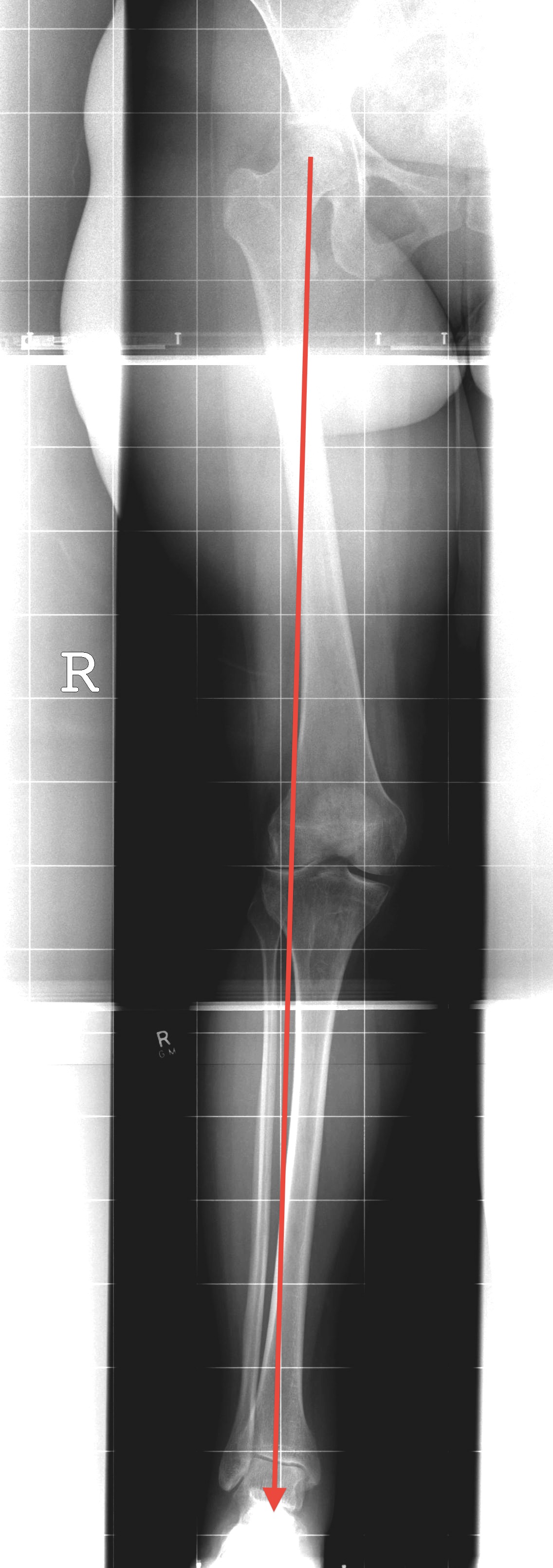 - neutral mechanical axis (weight bearing line between tibial spines)