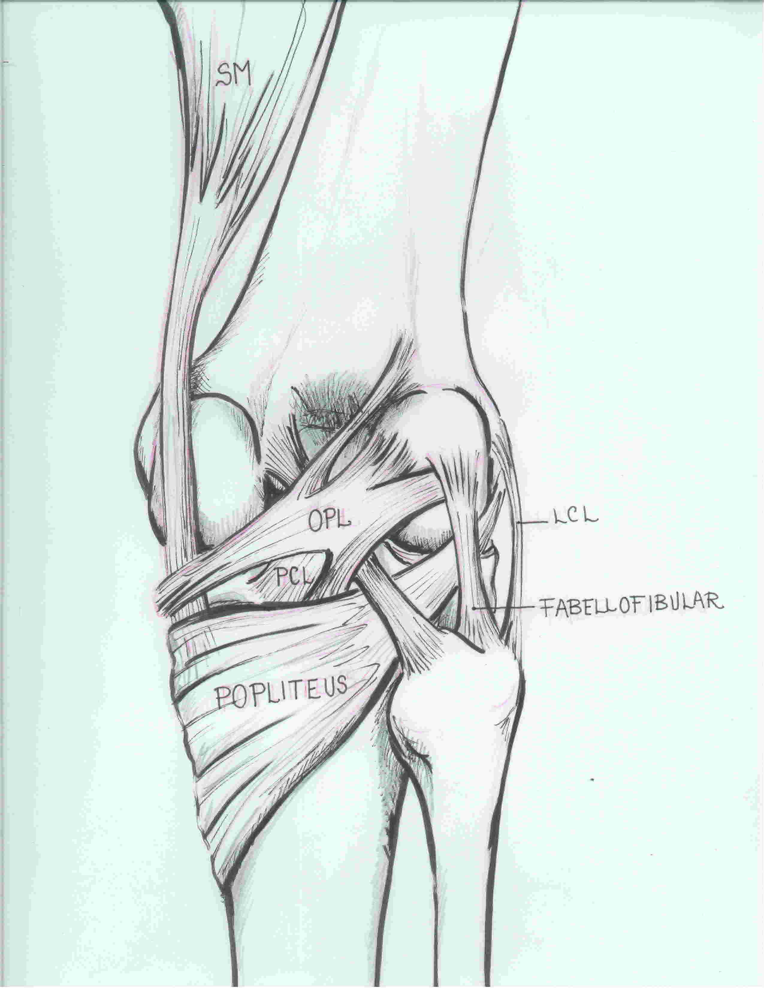 Triangular in shape Origin: 3 mm proximal and 5 mm posterior to the epicondyle Insertion: 6 cm distal to the joint line onto posteromedial tibia, deep to pes anserinus Anterior margin free |