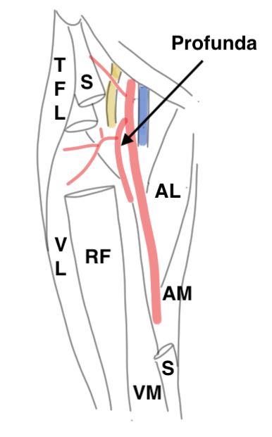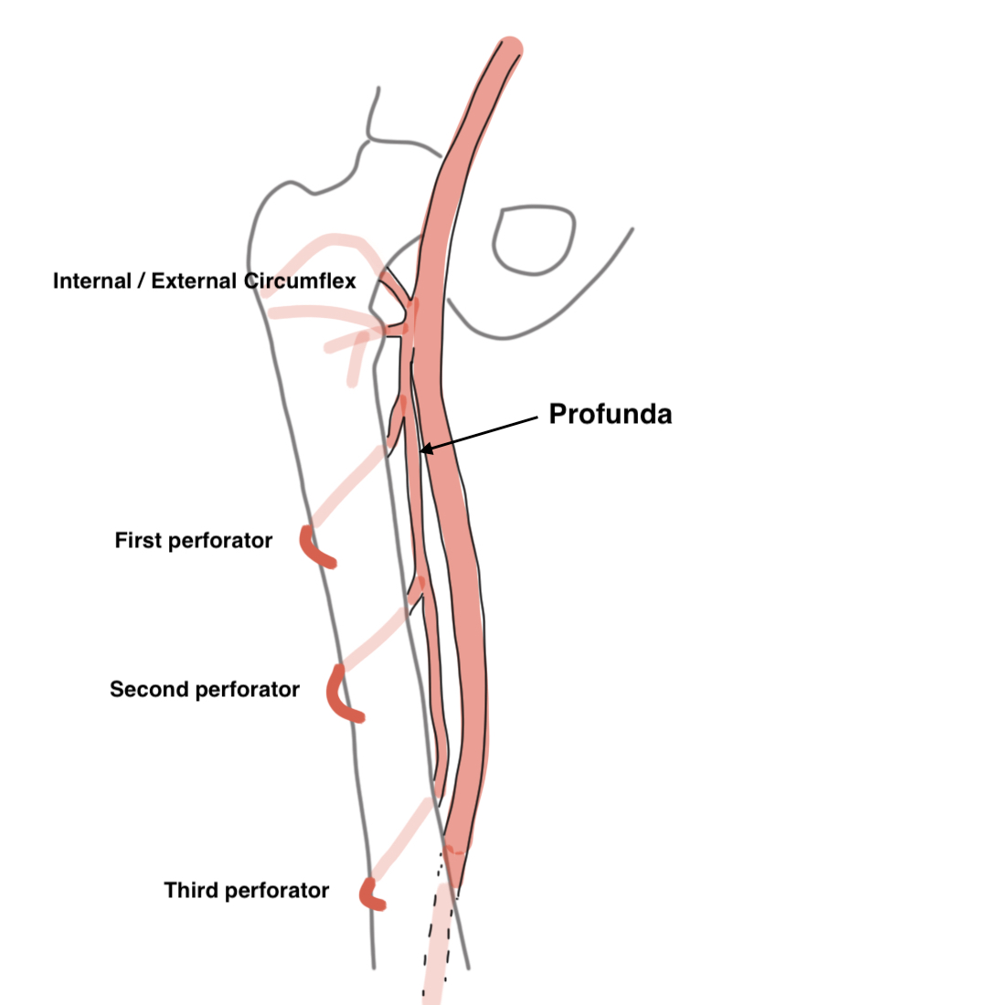 - passes across v. lateralis to wrap around proximal femur and supply cruciate anastomosis