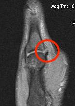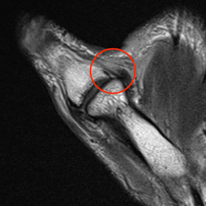 Distal tear of ulna collateral ligament on coronal MRI