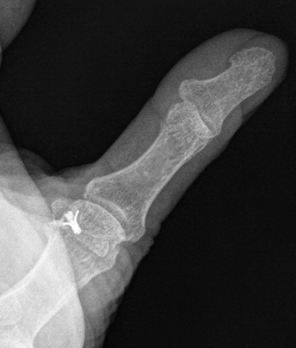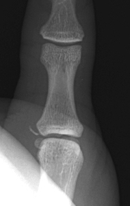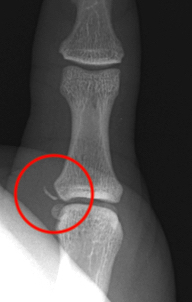 1. Small fragment pulled away from proximal phalanx