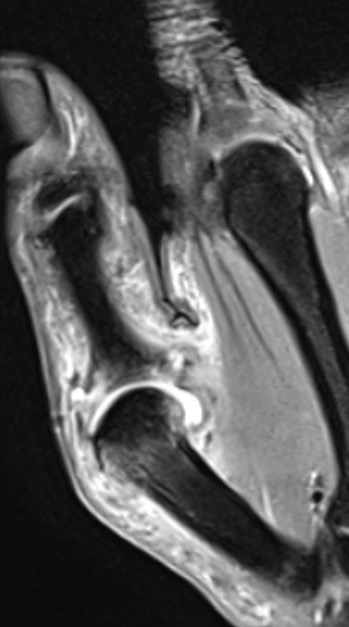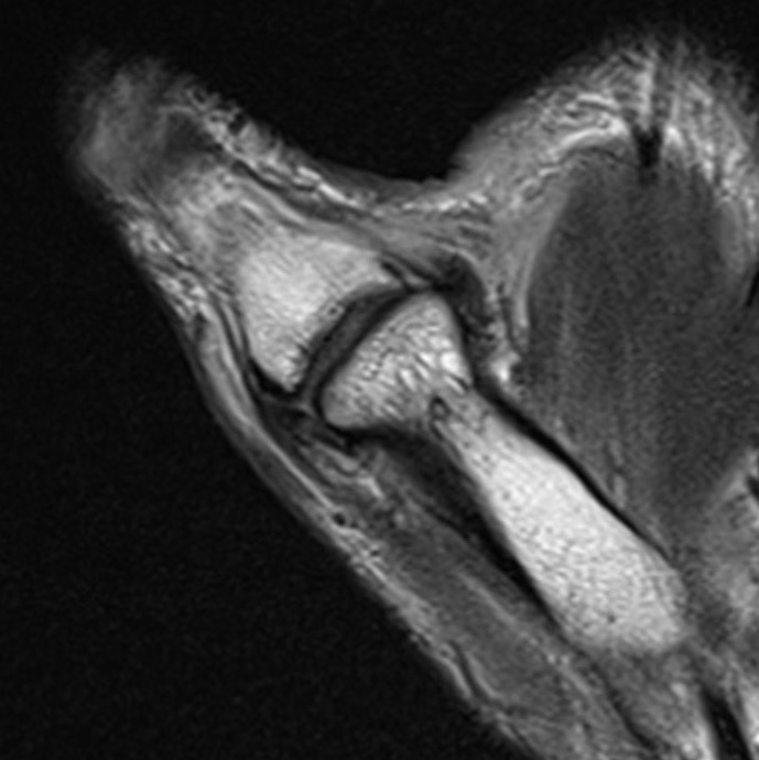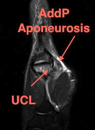 Coronal MRI demonstrating displaced distal UCL avulsion