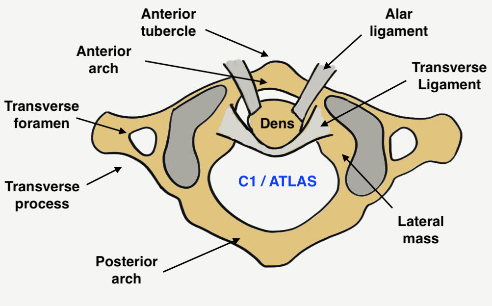 | Cruciform ligament | Transverse ligament - tubercles medial aspect lateral mass C1 | Prevents anterior displacement of atlas |