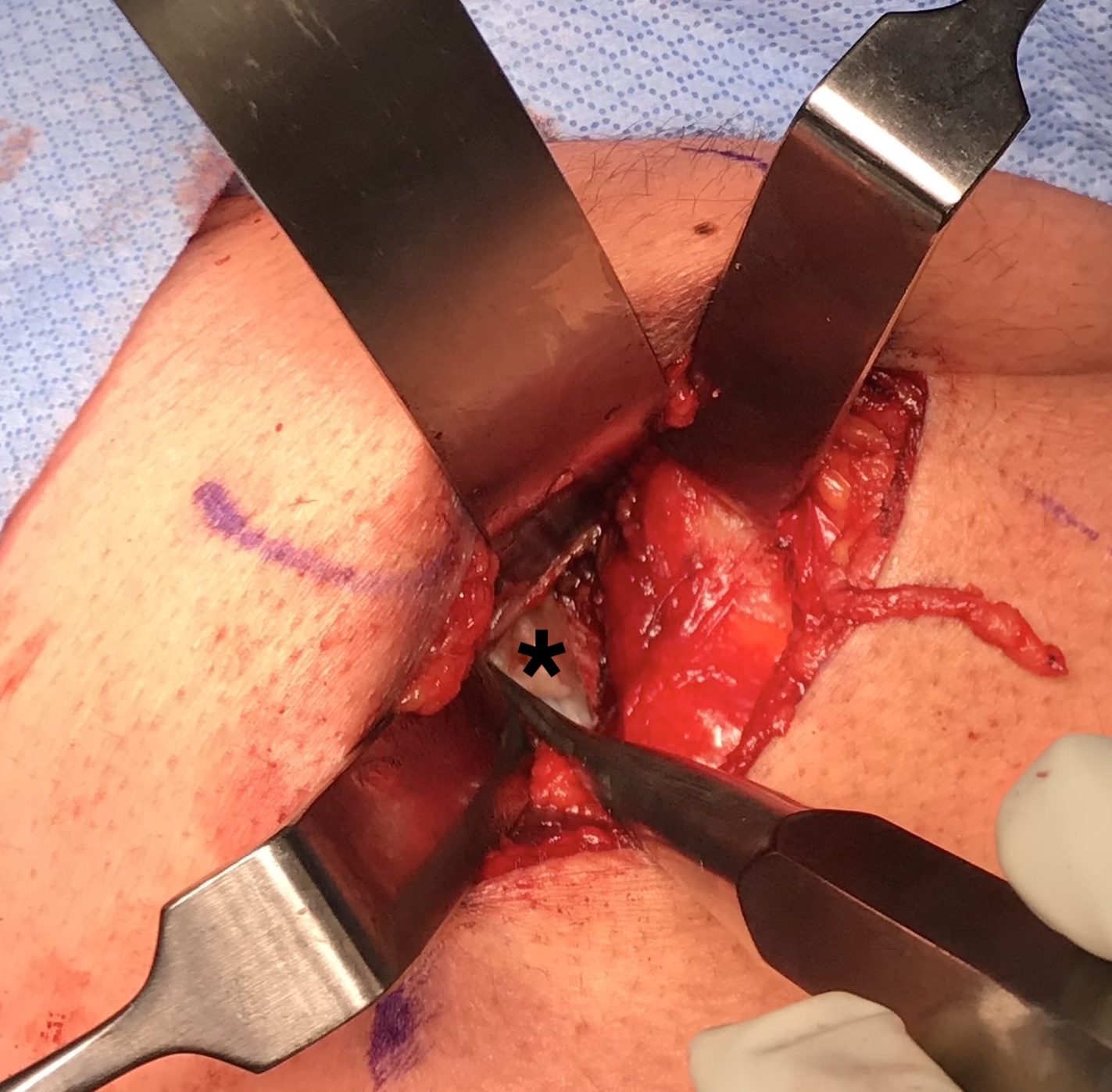 Elevate high grade tear with Cobb, exposing bare ischial tuberosity (*)