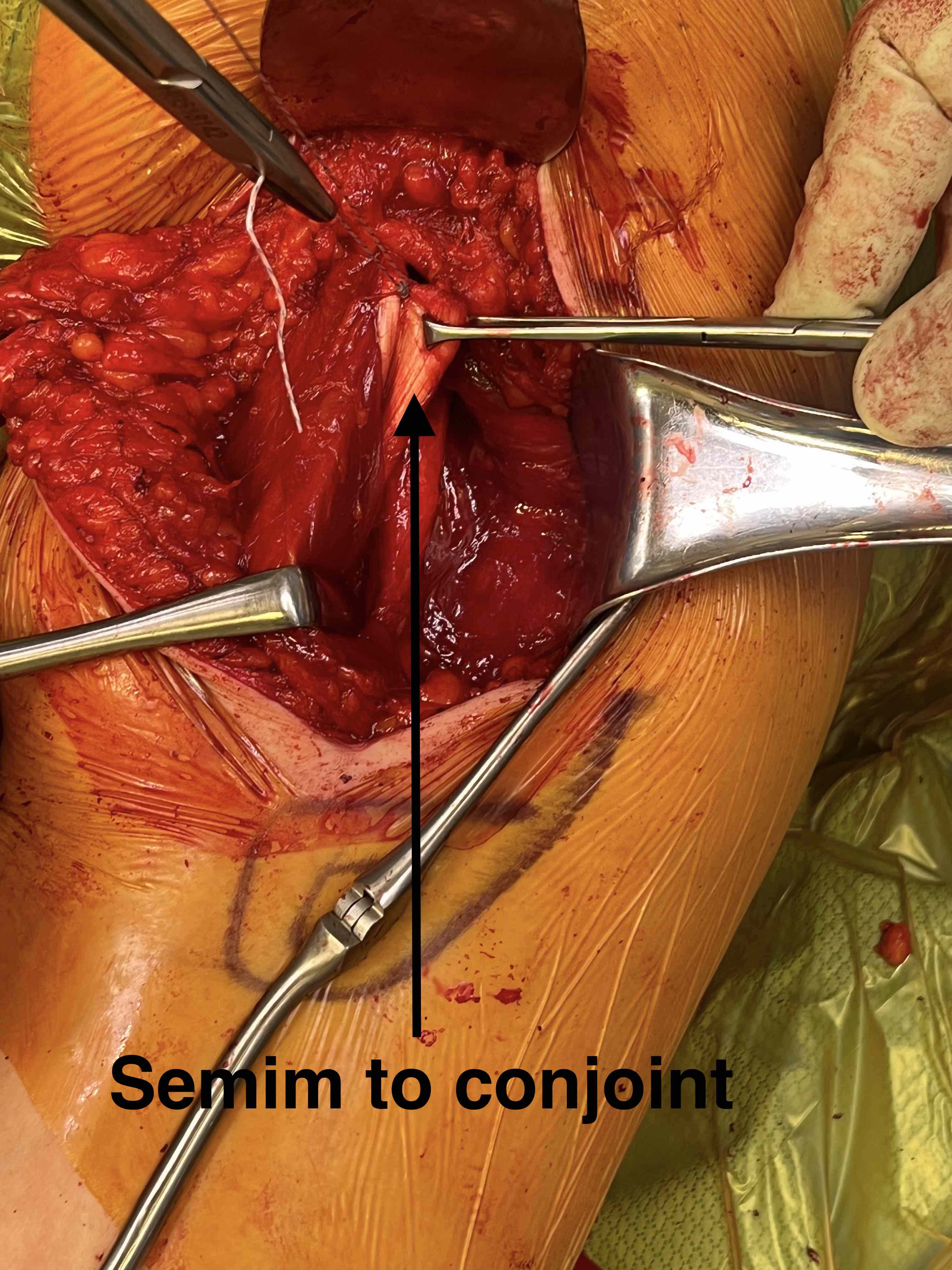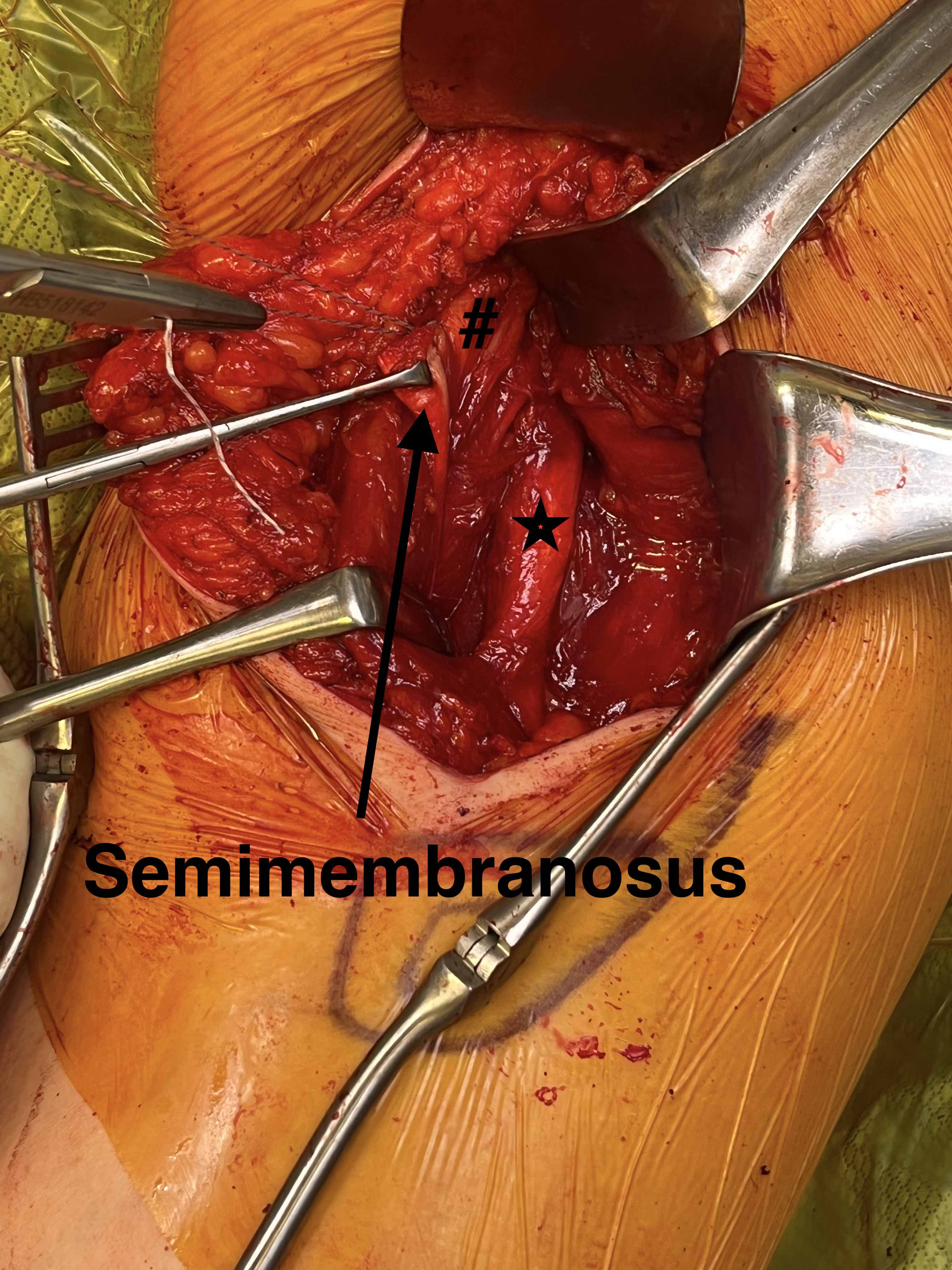 Divide semimembranosus tendon and suture to conjoint tendon (star - sciatic nerve, # - conjoint tendon)