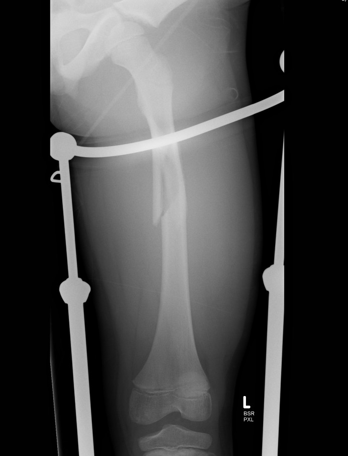 - Thomas splint with 2 fingerbreadths diameter clearance around thigh