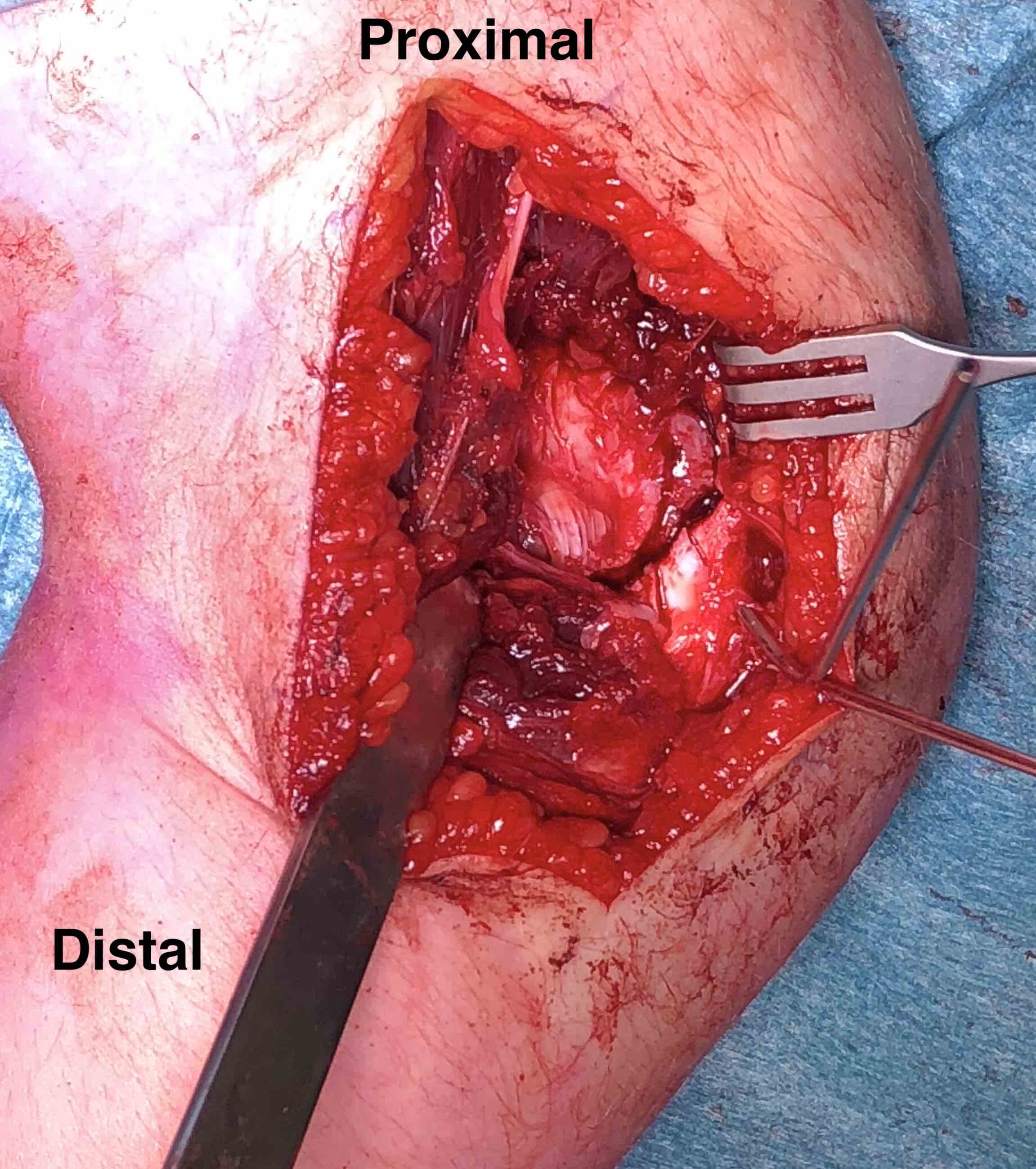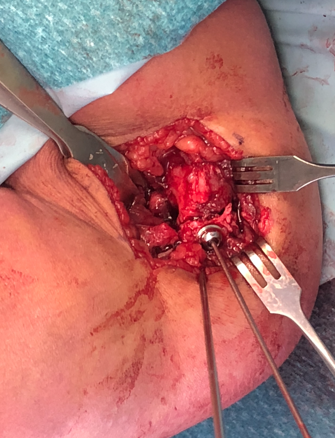 - distally split common extensor origin between ECRB and EDC and elevate anteriorly