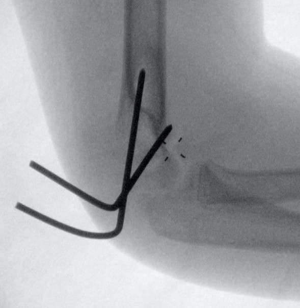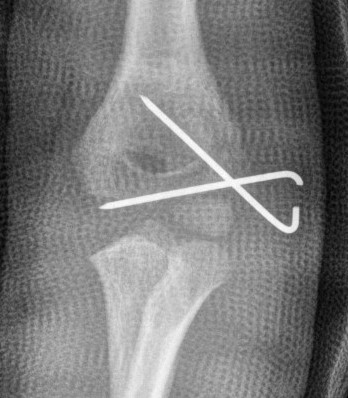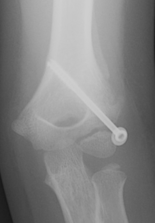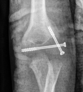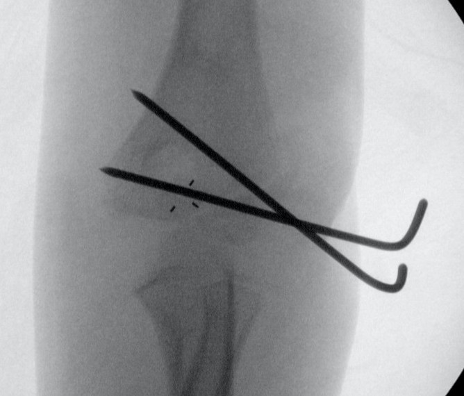 - one K wire at 45 degrees to first engaging medial metaphysis