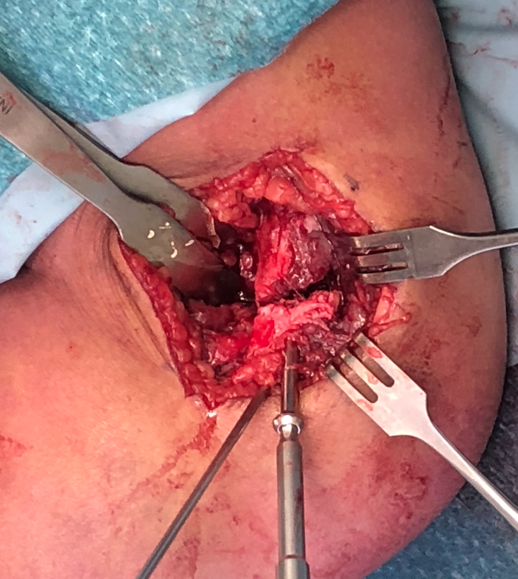- curved incision over lateral supracondylar ridge of humerus, and over proximal radius