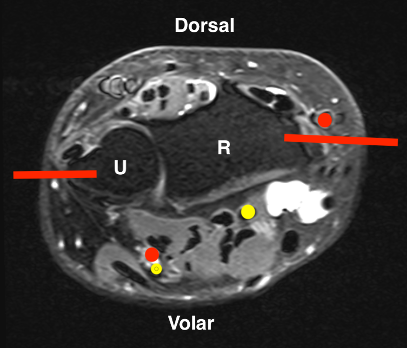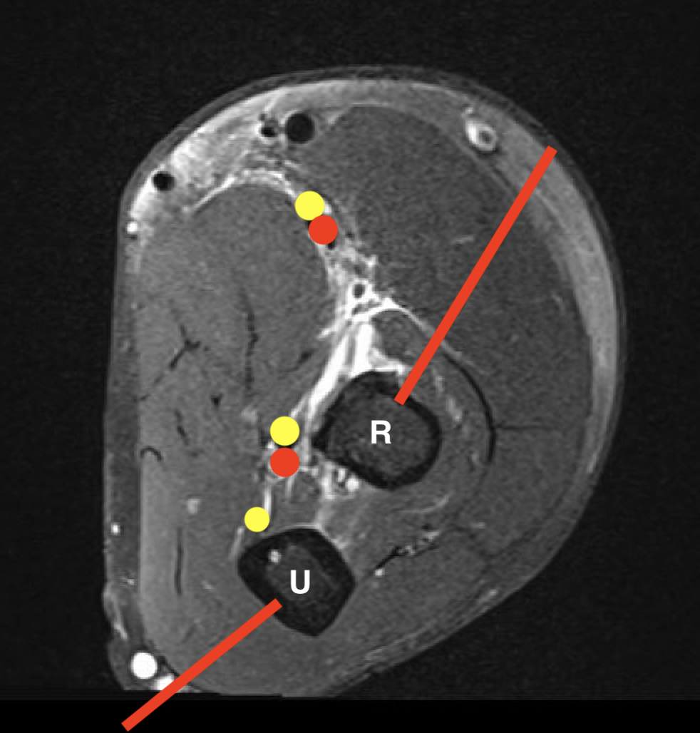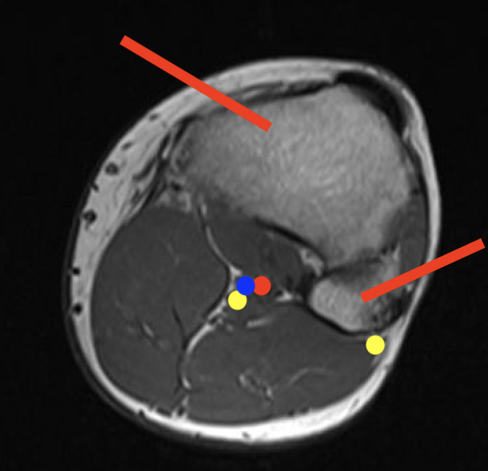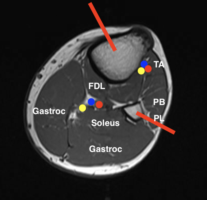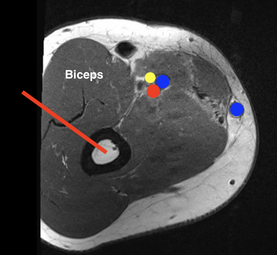 - aim anterior or posterior to lateral intermuscular septum depending on compartment