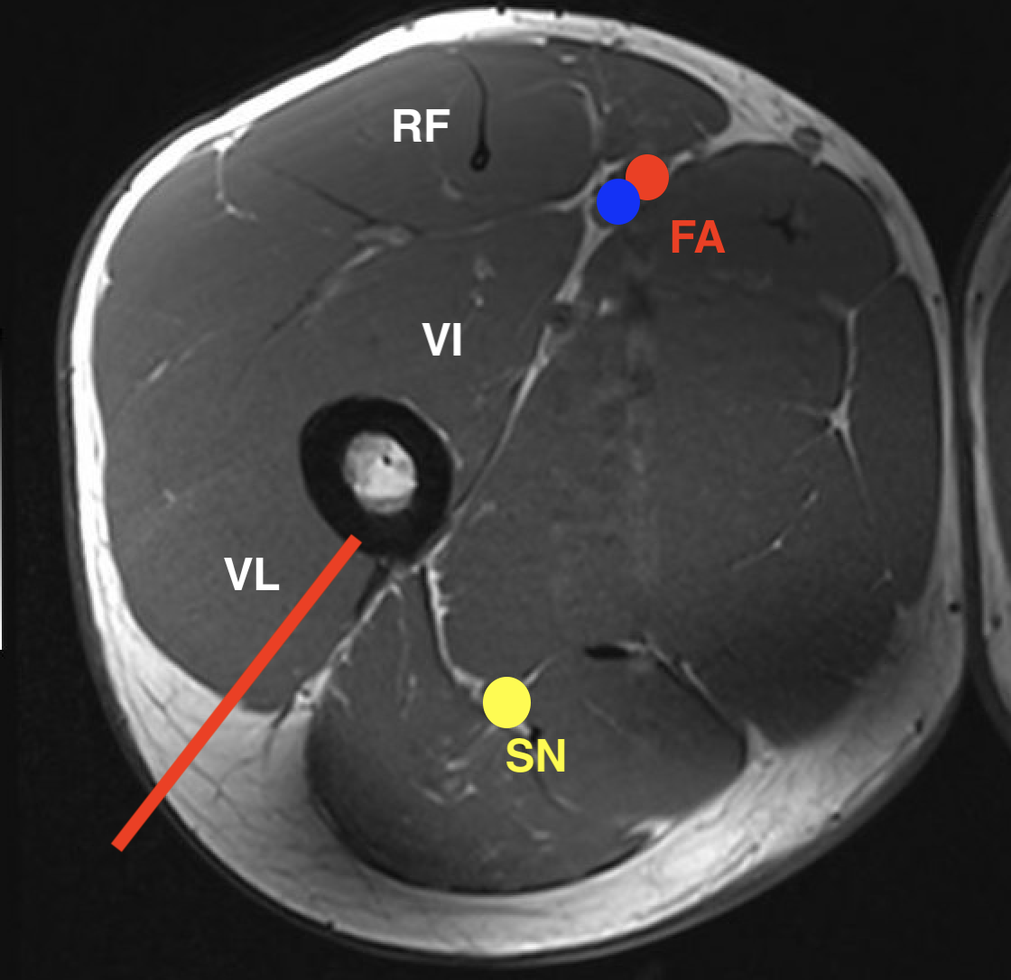 - through vastus lateralis / anterior to lateral intermuscular septum