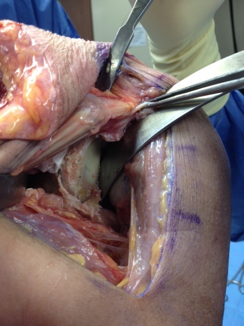 - expose inferior humeral flare
