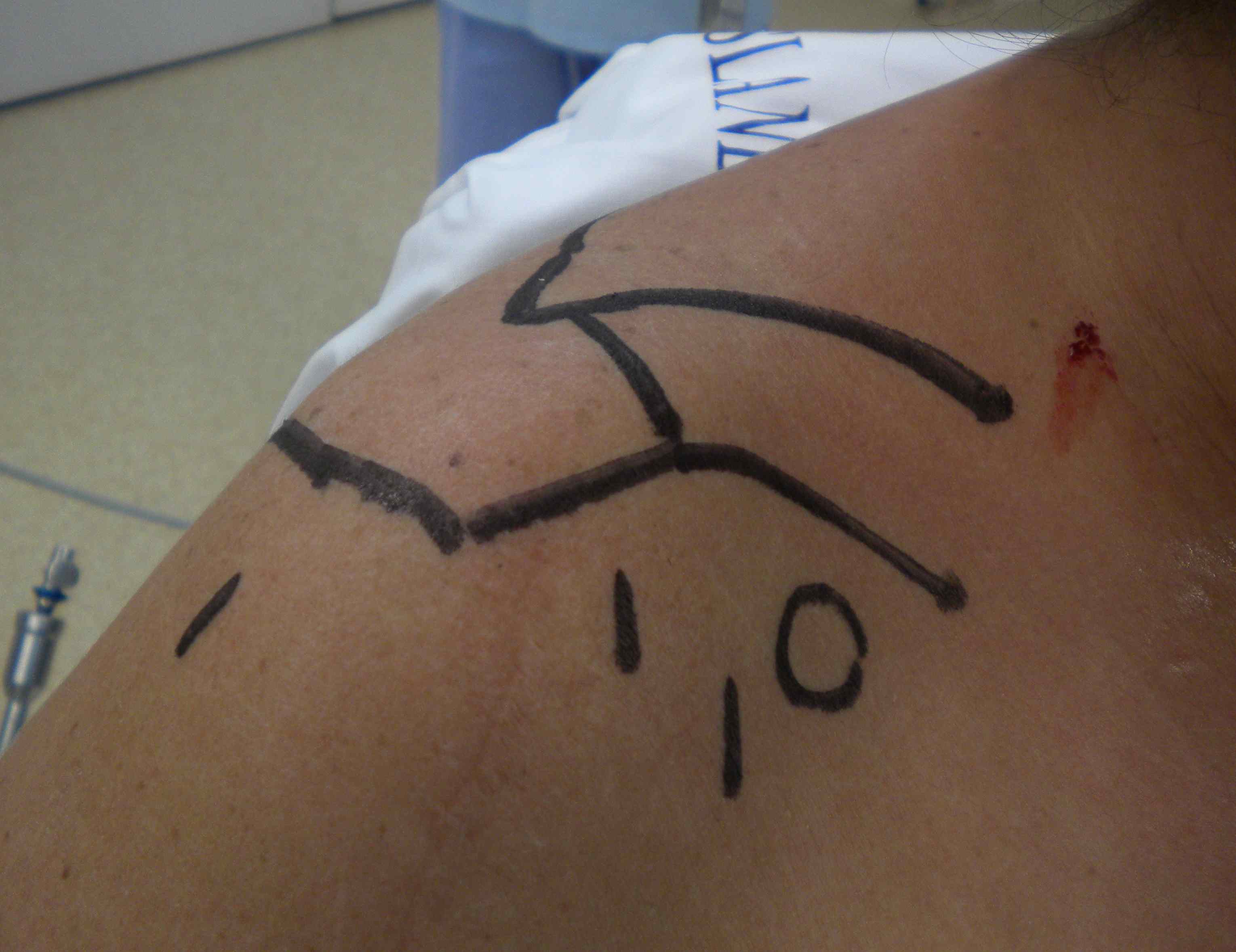 Identify posterolateral corner acromion 2 cm below and 2 cm medial Feel glenohumeral joint with trochar Aim towards coracoid |