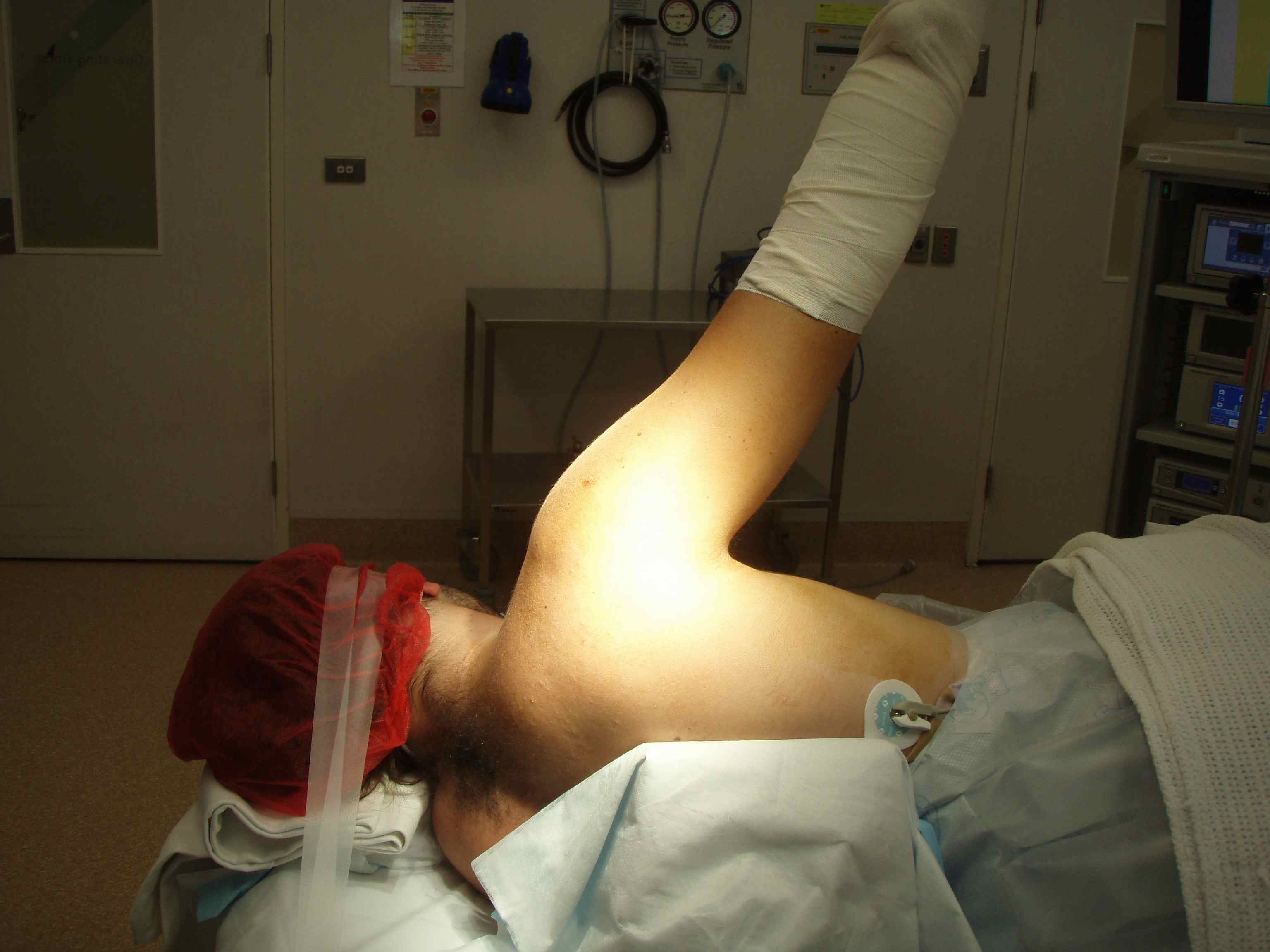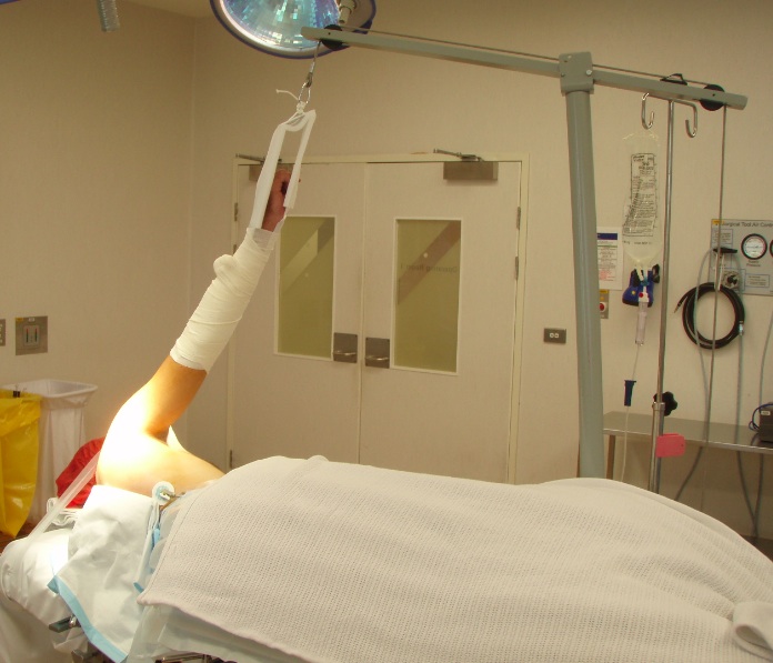 | Arm free draped on mayo / hydraulic arm holder | Arm abducted / lateral traction to glenohumeral joint |